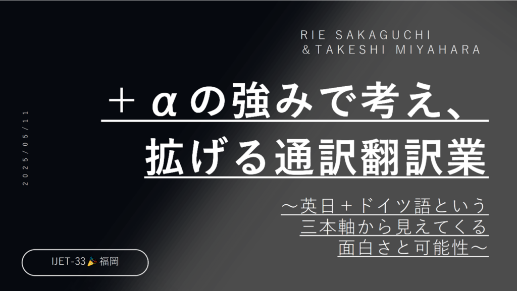 I hereby also would like to thank the all of colleagues who join JAT events including this IJETs. It’s been a very fruitful time for me to serve as a JAT volunteer. At the IJET-33, what made me very happy was that many IJET first-timer, with whom I chatted, shared their wonderful experiences at the event and gave positive feedback. I was also happy to find colleagues for a variety of language pairs (DE, FR, CH, MY…) besides English.